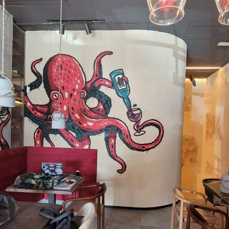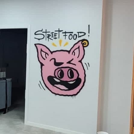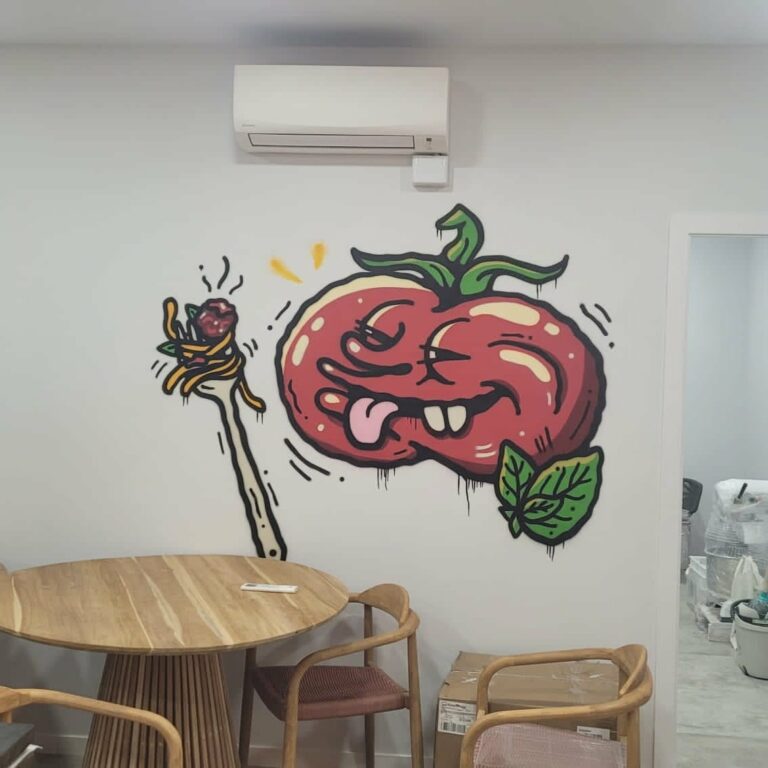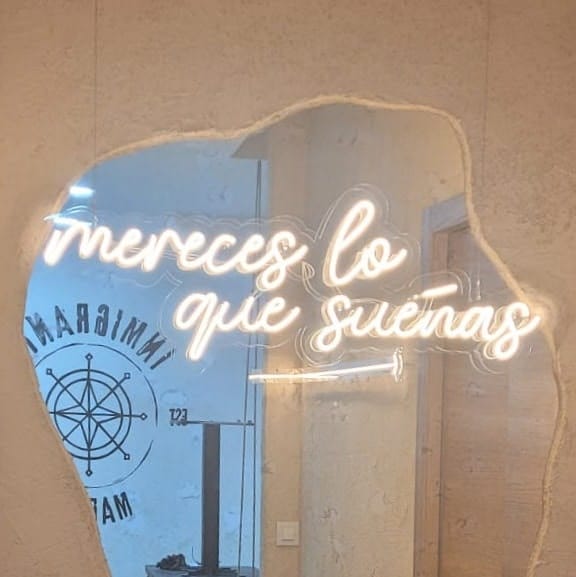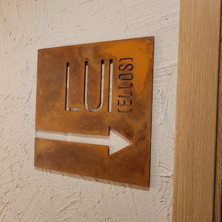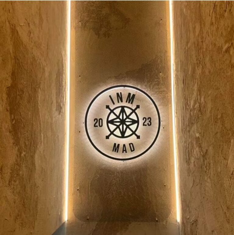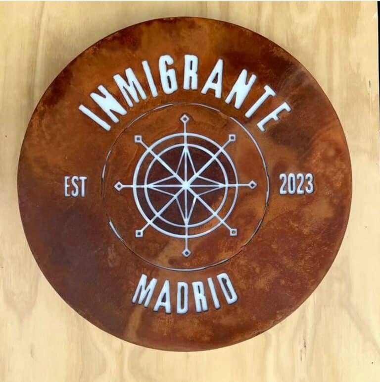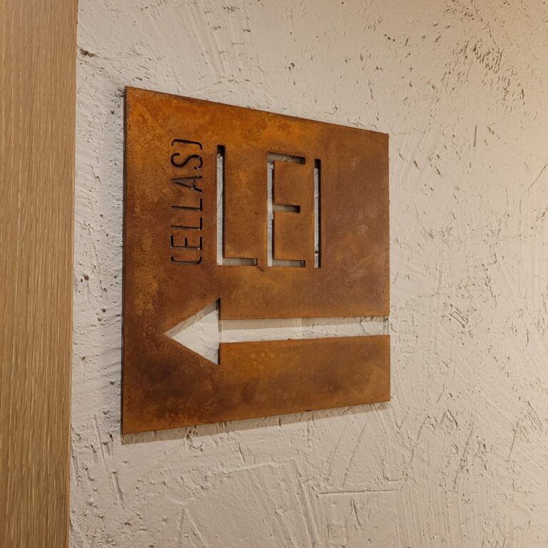 Fabricamos e instalamos original diseño para restaurante en Boadilla del Monte de rótulo luminoso de acero cortén, rótulos de neonled, vinilos ultratack para pared, vinilos de corte, luminoso de luz indirecta sobre malla metálica…
